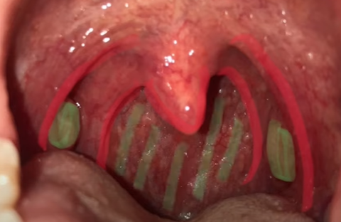 목에서 채취 부위는 유튜브에 나온 것처럼 편도와 목젖 뒤 부분인데요. 아래 노랗게 표시된 부분입니다. 양 옆에 있는 것이 편도입니다. 어떻게 채취하는지는 위 영상에 나옵니다.